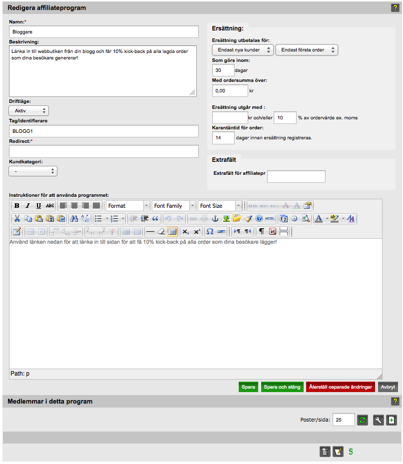 När du skapar/ redigerar ett affiliateprogram måst du först göra några grundinställnignar. Detär också härifrån du kommer att se medlemmarna i affiliateprogrammet, samt registrera utbetalningar.