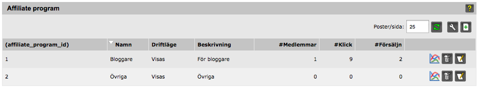 Under fliken Marknadsföring -> Affiliate visas en översik av alla affiliateprogram i webbutiken. Härifrån kan du Se säljstatisik, Ta bort eller Redigera affilaiteprogram genom att rycka på symbolerna till höger om varje rad. Du skapar ett nytt affilaterprogram genom att trycka på plussymbolen längst upp till höger.